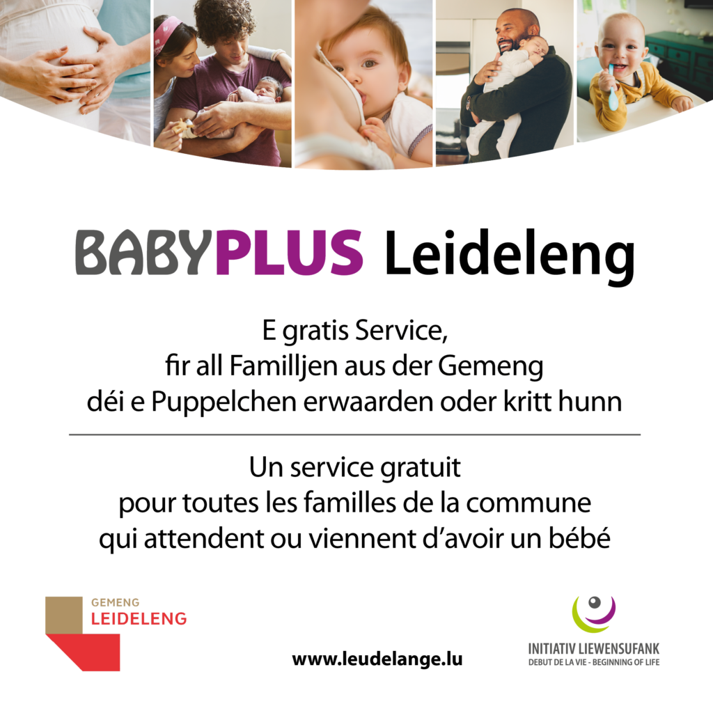D’Gemeng Leideleng ass houfreg Iech de Service BabyPlus a Kollaboratioun mat der Initiativ Liewensufank ze presentéieren. Hei kritt Dir gratis Infoen, Berodung a Begleedung wärend der Schwangerschaft a wärend dem 1. Liewensjoer vum Bëbee.