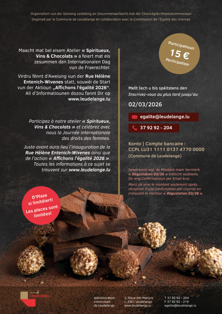 À l’occasion de la Journée internationale des droits des femmes, la Commune de Leudelange, en collaboration avec la Commission de l’Égalité des chances, vous invite à découvrir un programme riche et diversifié.