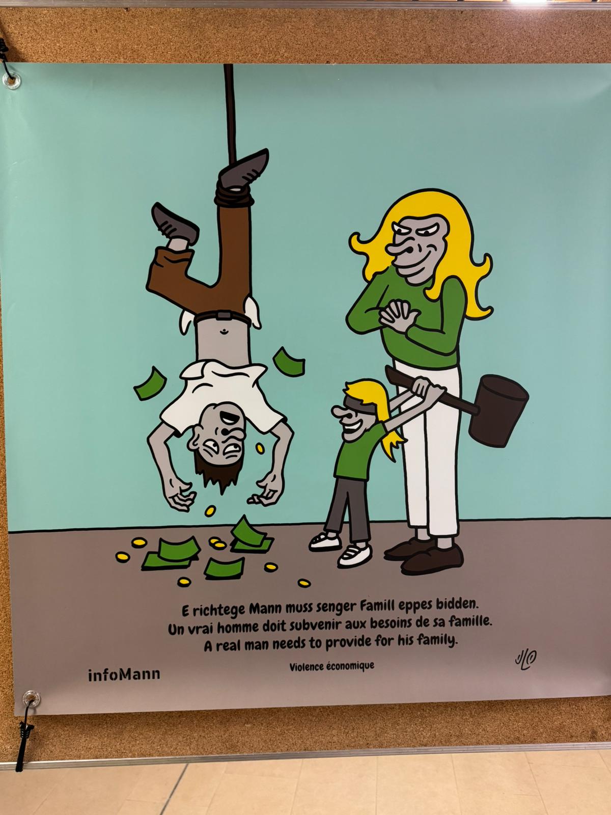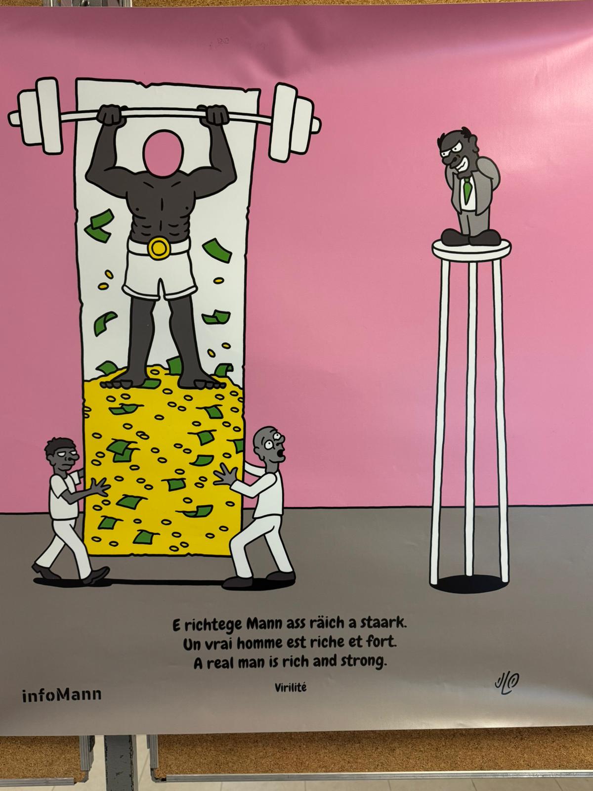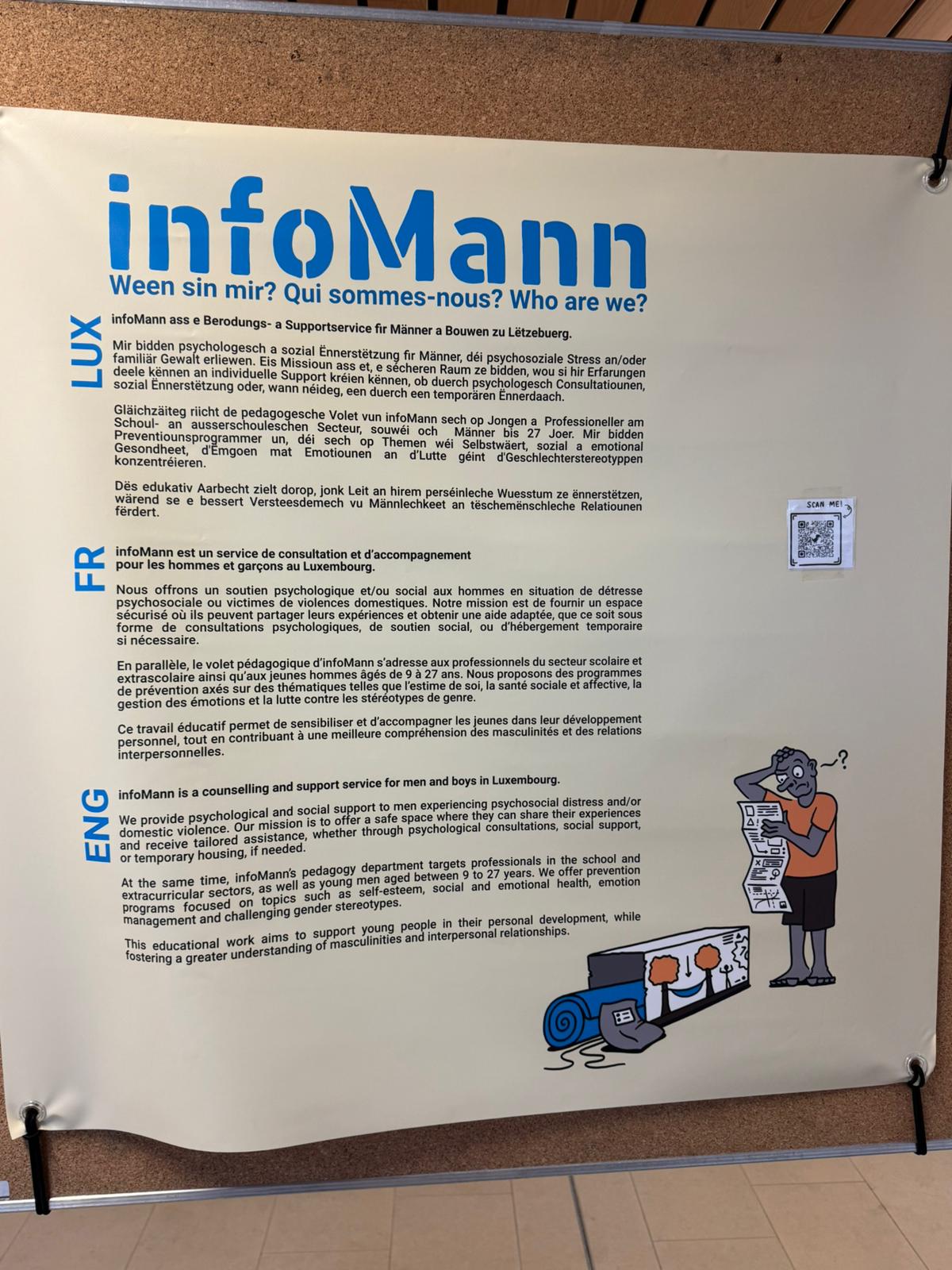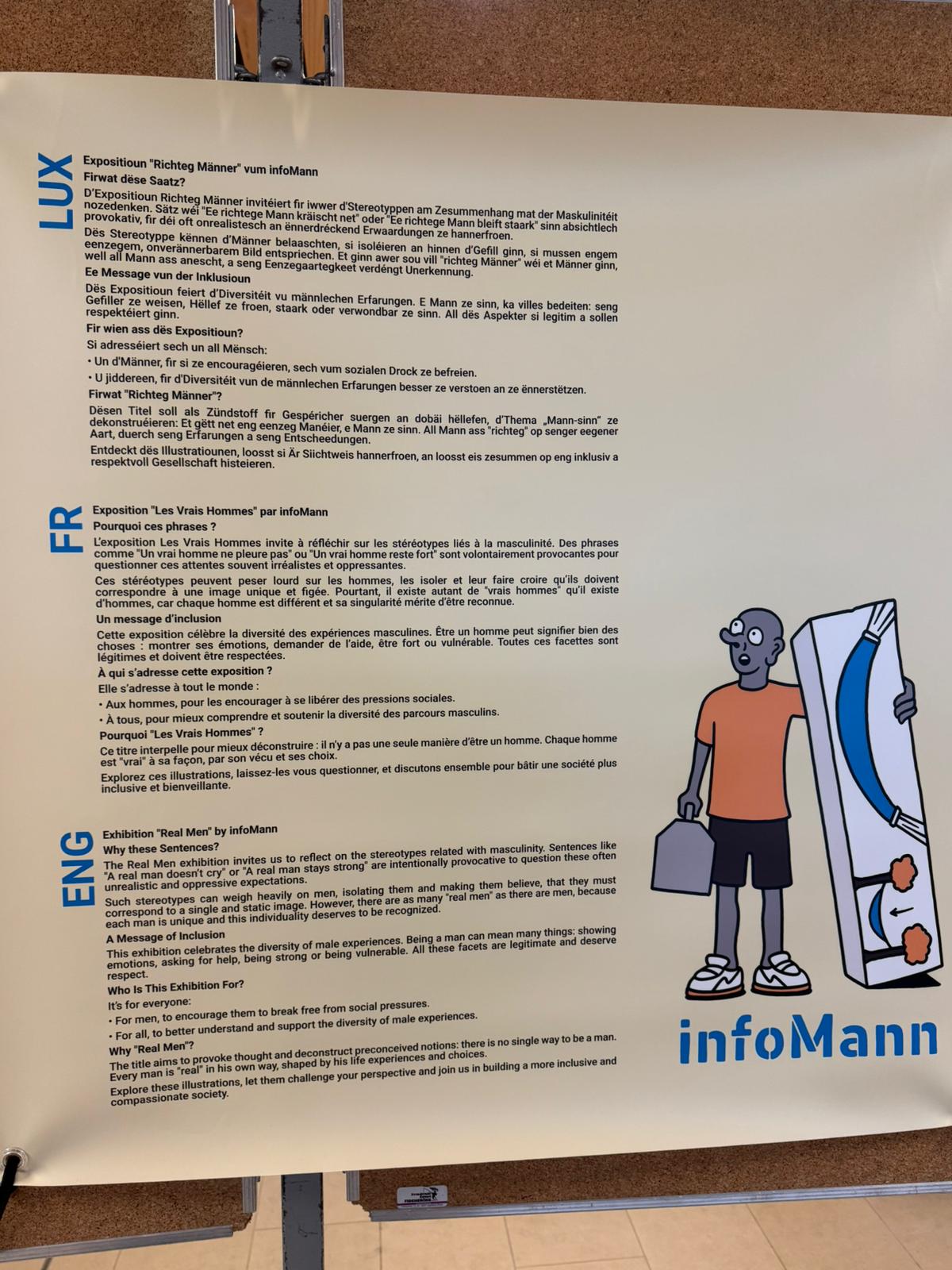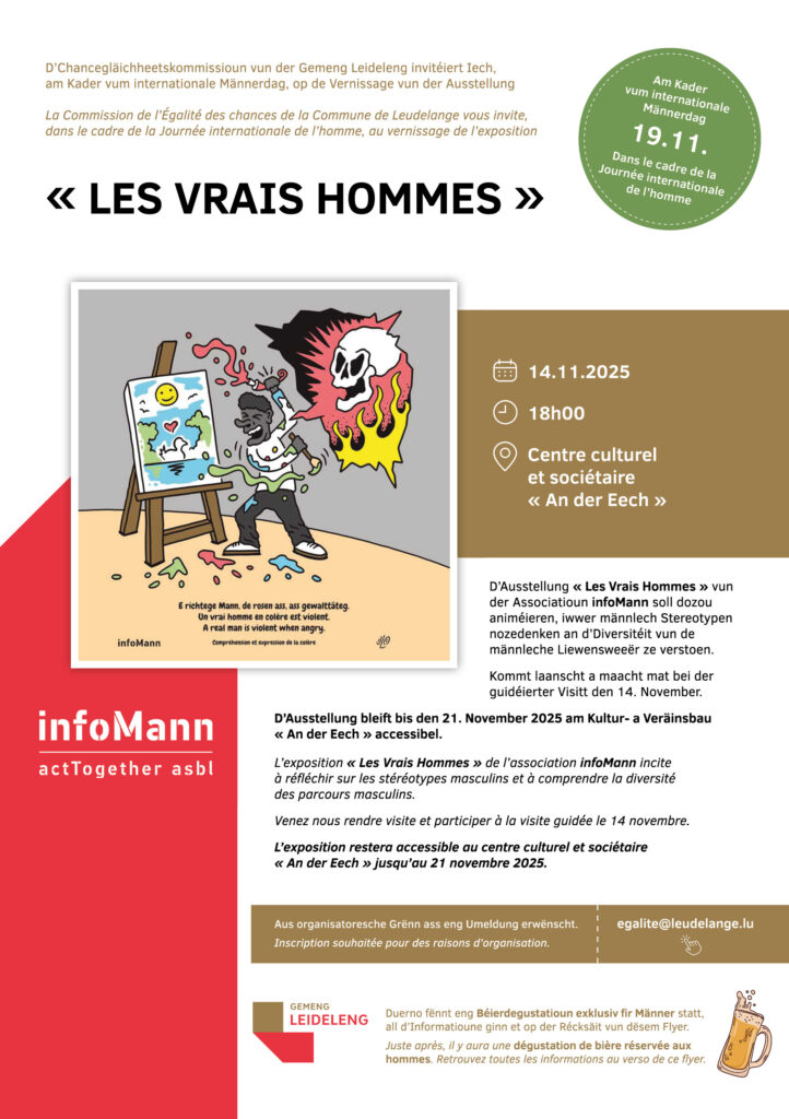 L’exposition «Les Vrais Hommes» continue au centre culturel et sociétaire An der Eech et reste visible toute la semaine jusqu’à vendredi. Si vous avez manqué le vernissage, c’est le moment parfait pour venir la découvrir, et vous pourrez sur place scanner le QR code pour accéder à toutes les informations. L’exposition «Les Vrais Hommes» de l’association infoMann incite à réfléchir sur les stéréotypes masculins et à comprendre la diversité des parcours masculins.