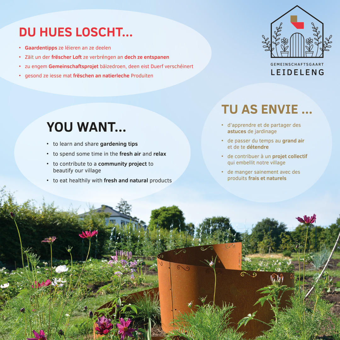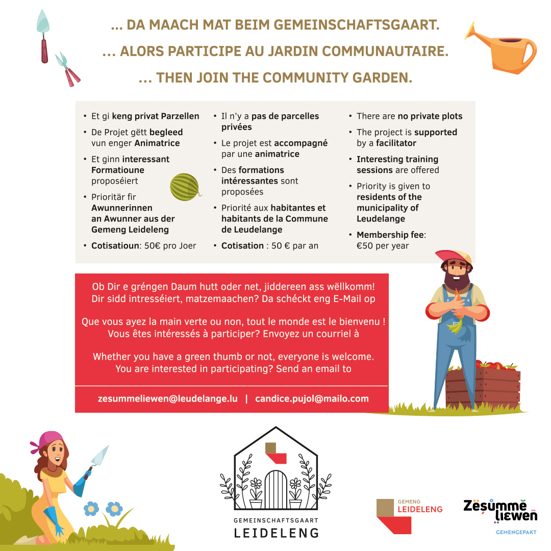 La Commune de Leudelange est à la recherche de nouveaux membres pour son jardin communautaire. Rejoignez un projet convivial en pleine nature, qui vous permettra de mieux découvrir la nature et l’environnement, tout en vous initiant au jardinage et aux différentes activités en lien avec la terre.