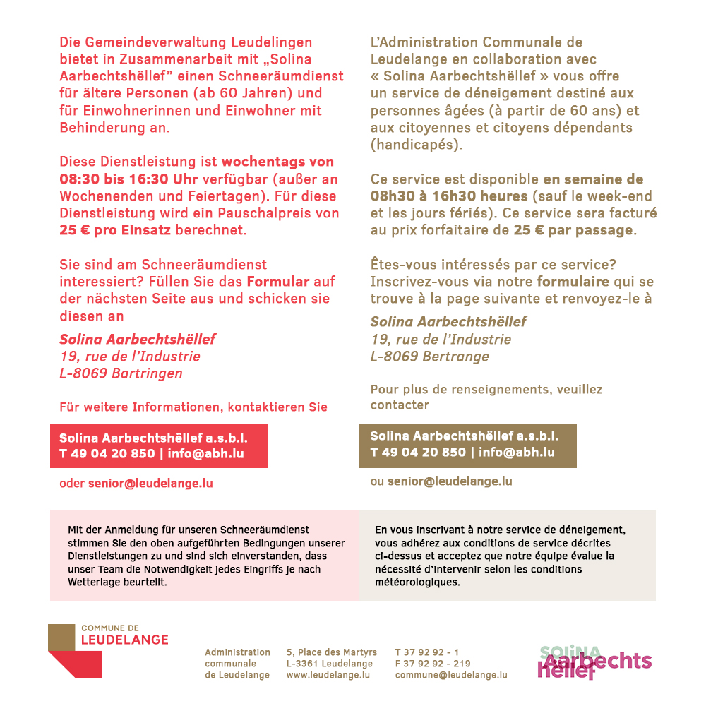L’Administration Communale de Leudelange en collaboration avec « Solina Aarbechtshëllef » vous offre un service de déneigement destiné aux personnes âgées (à partir de 60 ans) et aux citoyennes et citoyens dépendants (handicapés).