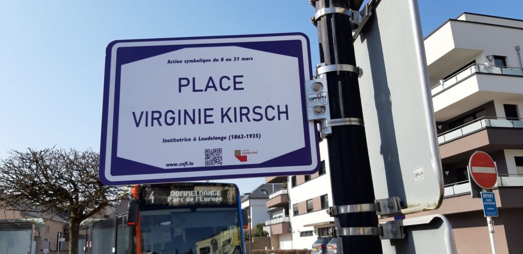 Cette année à l’occasion de la Journée internationale de la femme, différentes rues ont été rebaptisées symboliquement pour une durée limitée. La « Place des Martyrs » est devenue « Place Virginie Kirsch », institutrice de l’Ecole des Filles pendant 38 ans, de 1883 à 1921. La famille Kirsch est originaire de Moesdorf/ Mersch, où Anna Maria Virginie est née le 16 juillet 1861 des parents Nicolas Kirsch et Marguerite Klomp. La famille a habité à Leudelange depuis que le père y avait repris en 1872 une place d’instituteur. Malheureusement cet excellent pédagogue est décédé prématurément. Cependant, il avait orienté sa fille vers la profession d’institutrice. Le poste d’enseignant n’était pas simple. Depuis